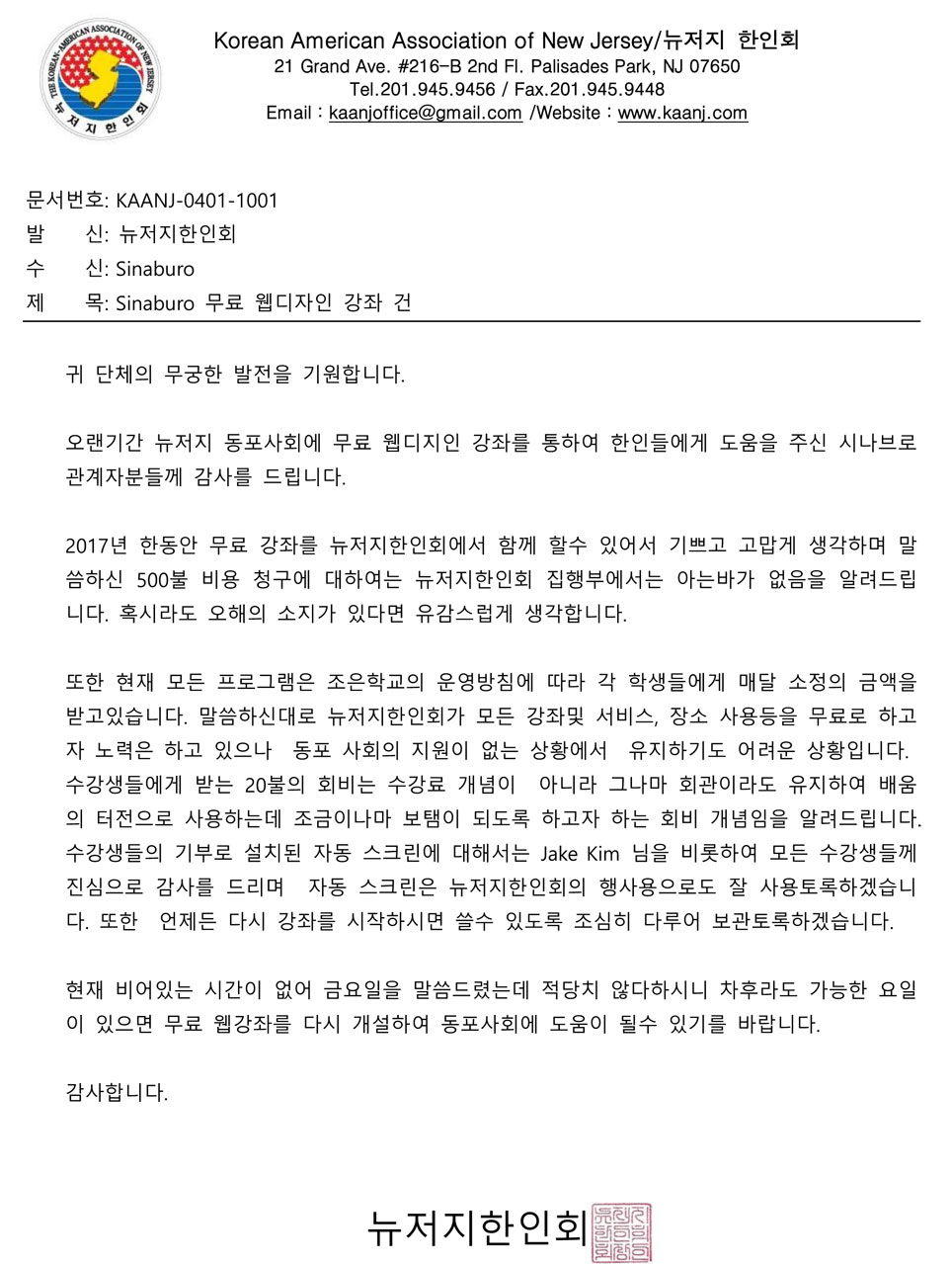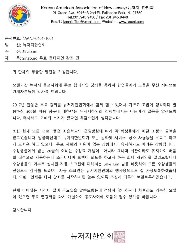 뉴저지 한인회 공식답변